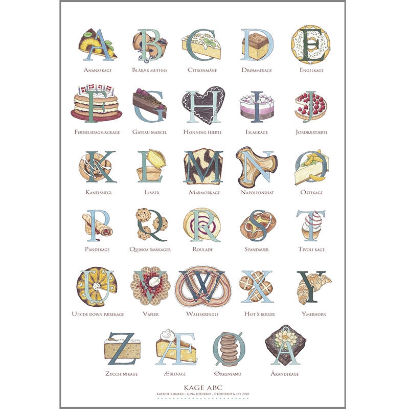 Teach children all the letters of the Danish alphabet with this inviting and tasty ABC poster featuring cakes. A new, decorative poster for the children's room or the kitchen, with a cake associated with each letter.
