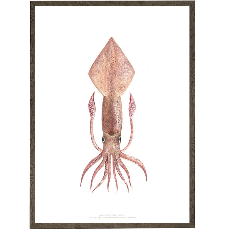 The squid, which belongs to the molluscs, is closely related to snails and mussels. The animal occurs in eight- and ten-armed forms, and in fact there are 10 different squid species in Denmark. This loligo squid has ten arms and is one of two common squids in Danish waters.
