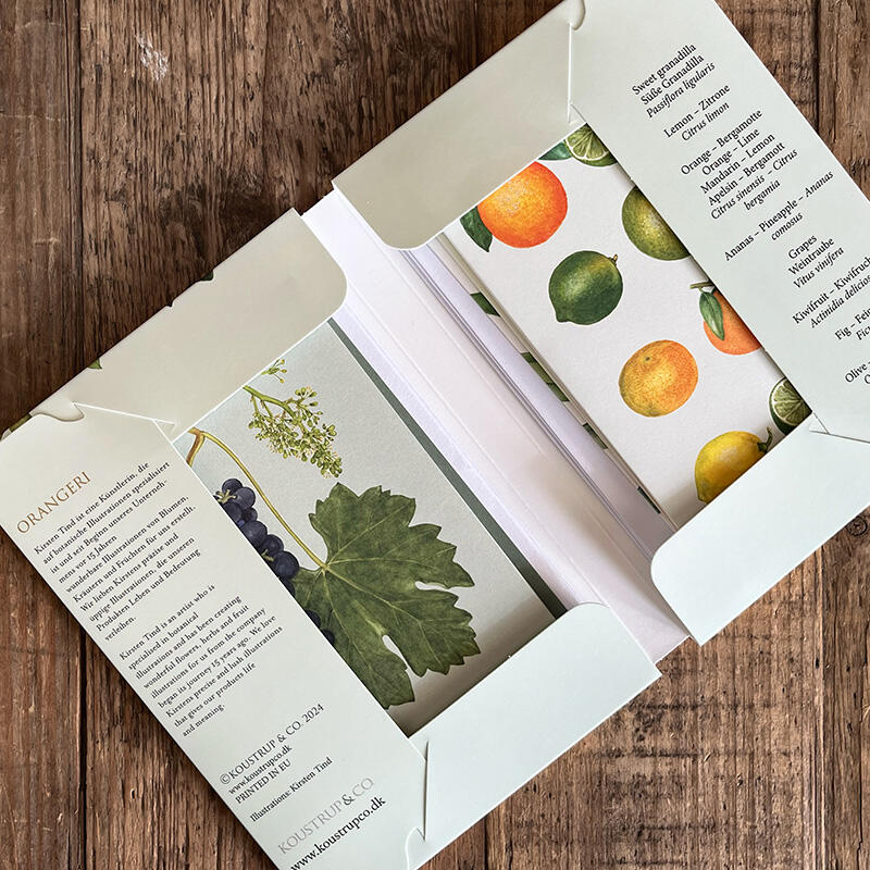 With her precision and fine line work, Kirsten Tind has drawn a host of wonderful flowers and plants, and for this card set she has created eight beautiful fruits that all suit an orangery well.