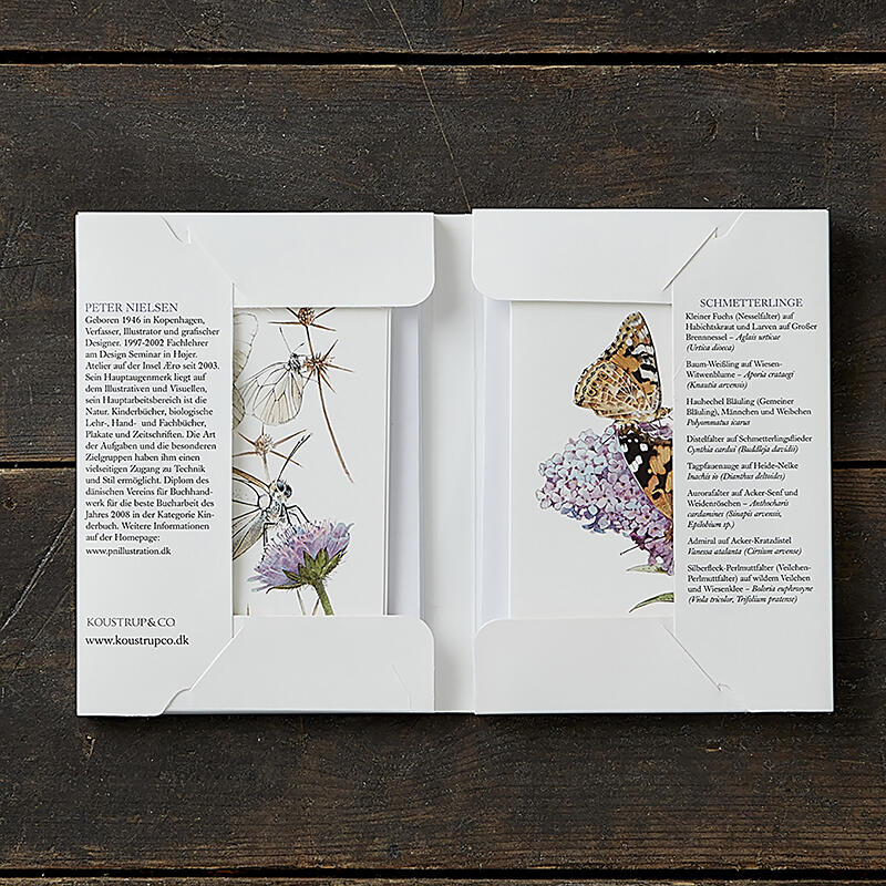 The card set contains 8 envelopes and 8 different folded cards with butterfly motifs. The beautiful illustrations are by Peter Nielsen.