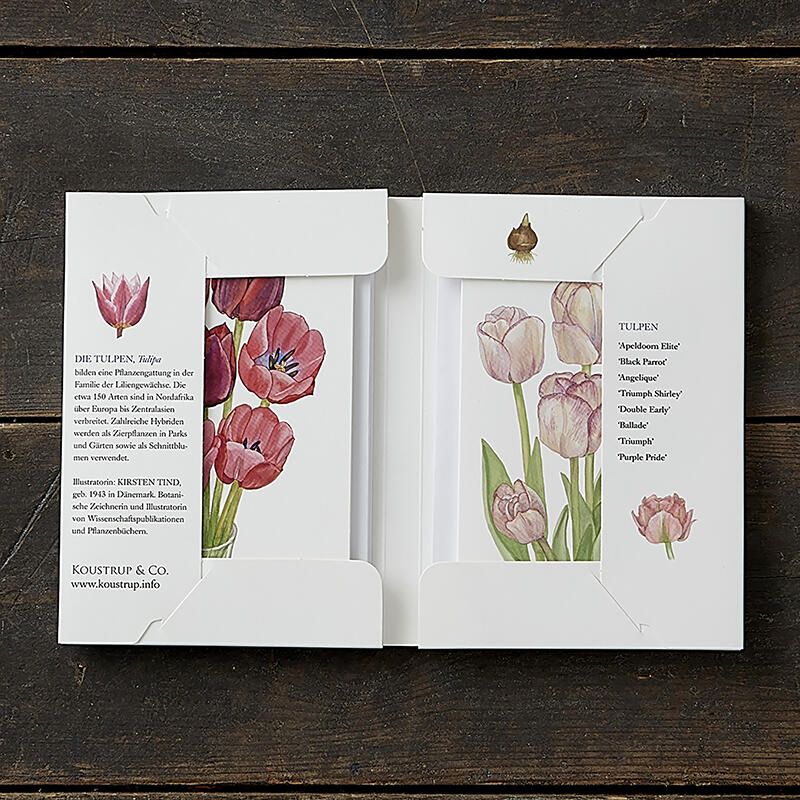 The card folder contains 8 envelopes and 8 different folded cards with tulip motifs.