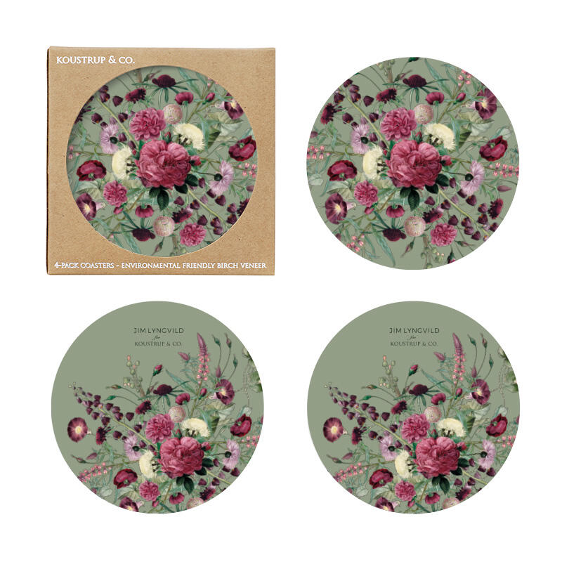 The glass coasters, with a lovely and elegant floral design in pink and purple tones are part of the new collection "Blossom Garden", created in collaboration with Jim Lyngvild.