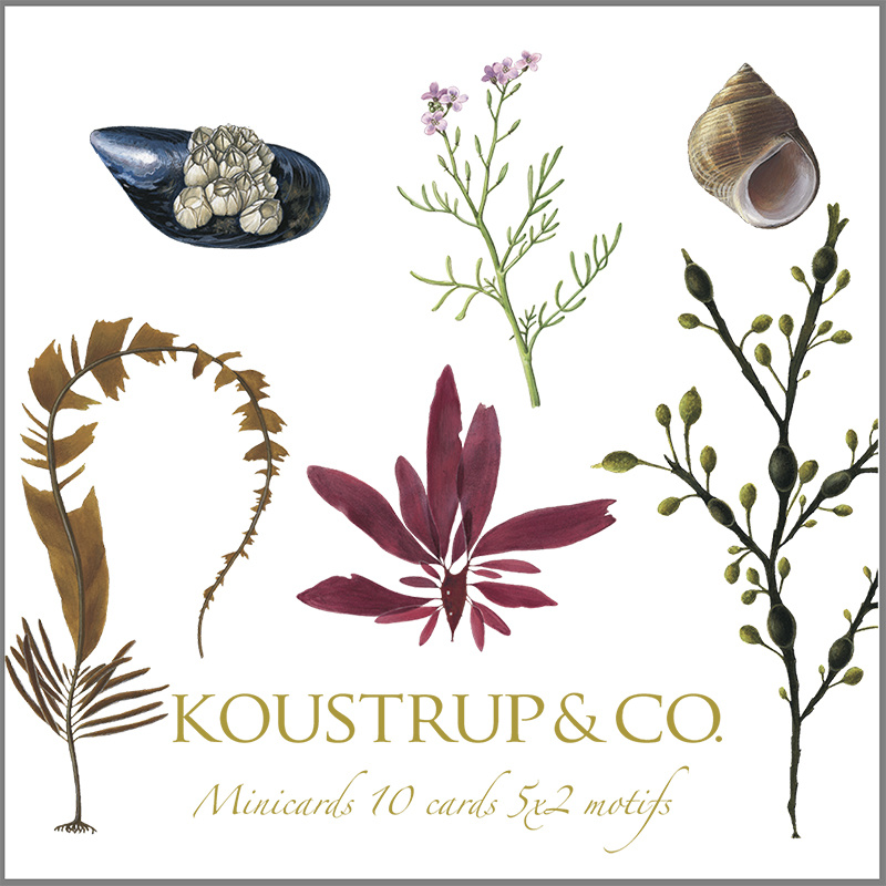 Square mini cards featuring edible animals and plants from the shore and sea, illustrated by Susanne Weitemeyer.