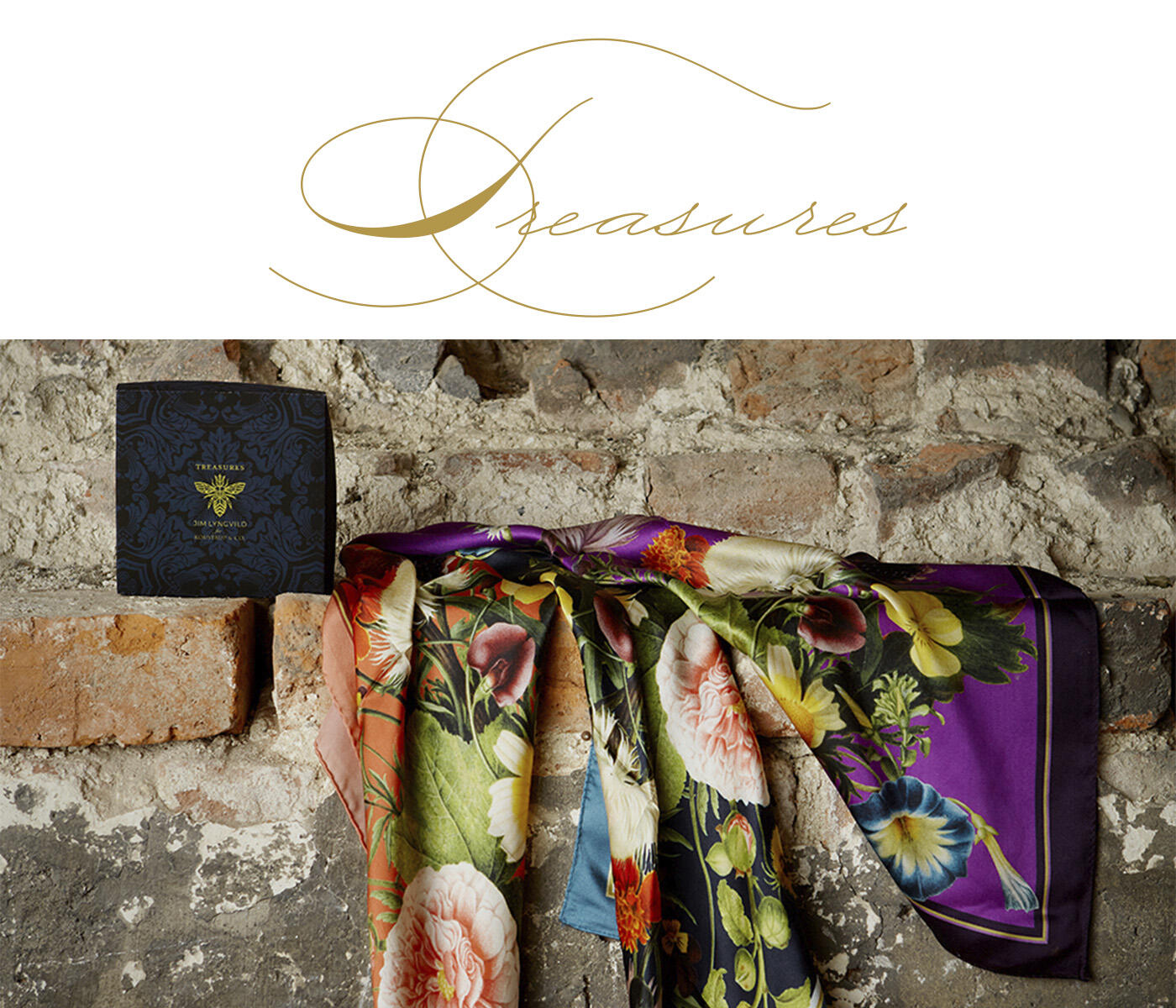 The TREASURES-collection contains also beautiful silk scarves with botanical floral motifs as well as Jim Lyngvild's lavish kings and queens from Danish history.